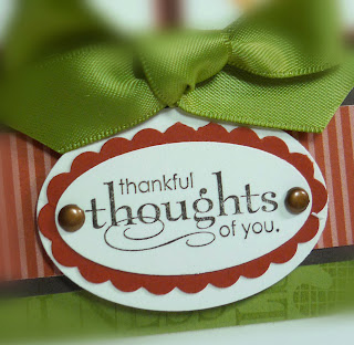 It's about this time of the month that I think of fall- although I live here in the desert and we do not have the colors of fall around us, these colors still remind me of it. I used Old Olive, Cajun Craze, Early Espresso and Peach Parfait. I did not think that the SA wheel was going to show as much because it was done on Versamark but looks like the camera captured it well. The squares I popped with dimensionals and the sentiment as well. I used the Old Olive satin ribbon for accent. Hope you like it.