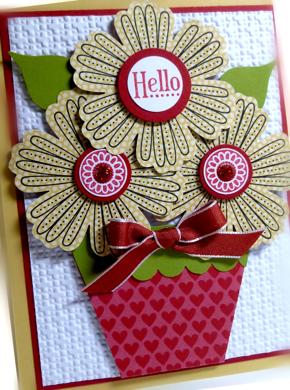 I just love this sweet card that I cased from Jennifer's blog ( Sunflower Stamper) using the Mixed Bunch stamp set. I love that she used the Cherry Cobbler glitter on her flowers. I made a few changes on mine to make it my own- added the glitter in the center of my flowers and a ribbon bow for my added accent. I used the sentiment from the Posy Punch Hostess set that will soomn be retiring so do not miss the opportunity not to order it. I stamped the flowers in DSP. Hope you like it.